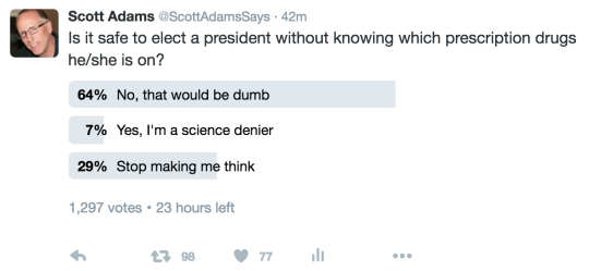 Would you feel safe voting for a presidential candidate without knowing which prescription drugs he or she is taking? I asked the question on Twitter and got this result so far.