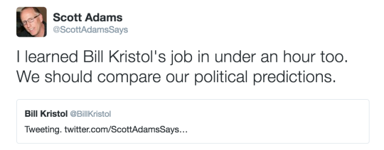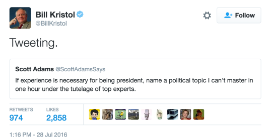 This caused a predictable crap-tornado on Twitter. One of the most popular retorts came from Bill Kristol who replied “Tweeting.”