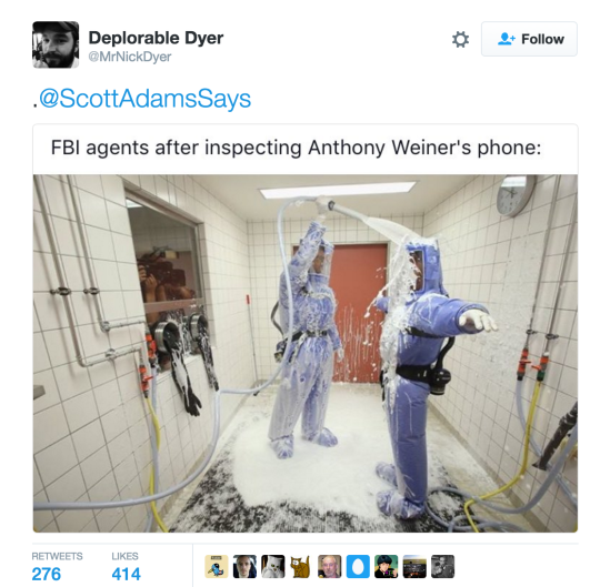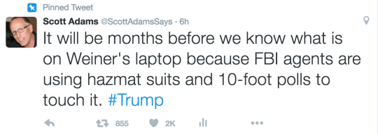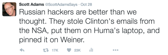 So compare this movie to your own movie and see which one does the best job of explaining the observed facts. And when we find out what is in the Weiner laptop emails, compare that news to my prediction that the information is disqualifying.