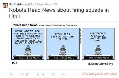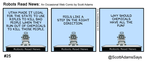 Today I bring you a Robots Read News episode engineered to get a healthy number of “favorites” on Twitter but relatively few retweets. The hypothesis is that people enjoy dark humor but they are cautious about associating with it, and wisely so.