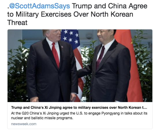 First we must acknowledge that a win-lose model has no chance of success in this specific case because North Korea responds to threats by working harder to build nukes. That’s no good. You need some form of a win-win setup to make any kind of deal. That’s what I’m about to suggest. And by winning, I mean both sides get what they need, even if it isn’t exactly what they said they want.