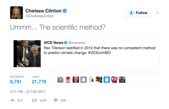 As a perfect example, I give you this fresh tweet history from Rex Tillerson and Chelsea Clinton.