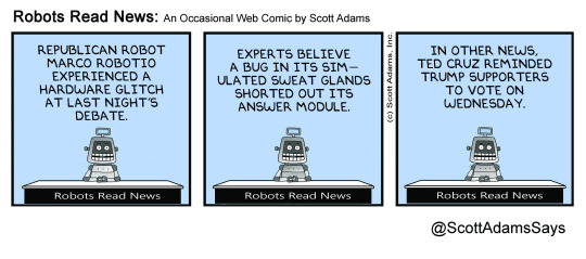 Trump: Trump acted controlled and more presidential to counter the idea that he’s a loose cannon. That strategy looked effective to me. And as Trump often does, he produced one irresistible piece of news candy by suggesting he was in favor of some sort of unspecified torture. It was classic Trump. He likes to focus attention on anchors that are easy to discuss, easy to understand, and have a visual component. Who is toughest on terrorism, you wonder? Probably the pro-torture candidate. That’s what your irrational mind tells you.